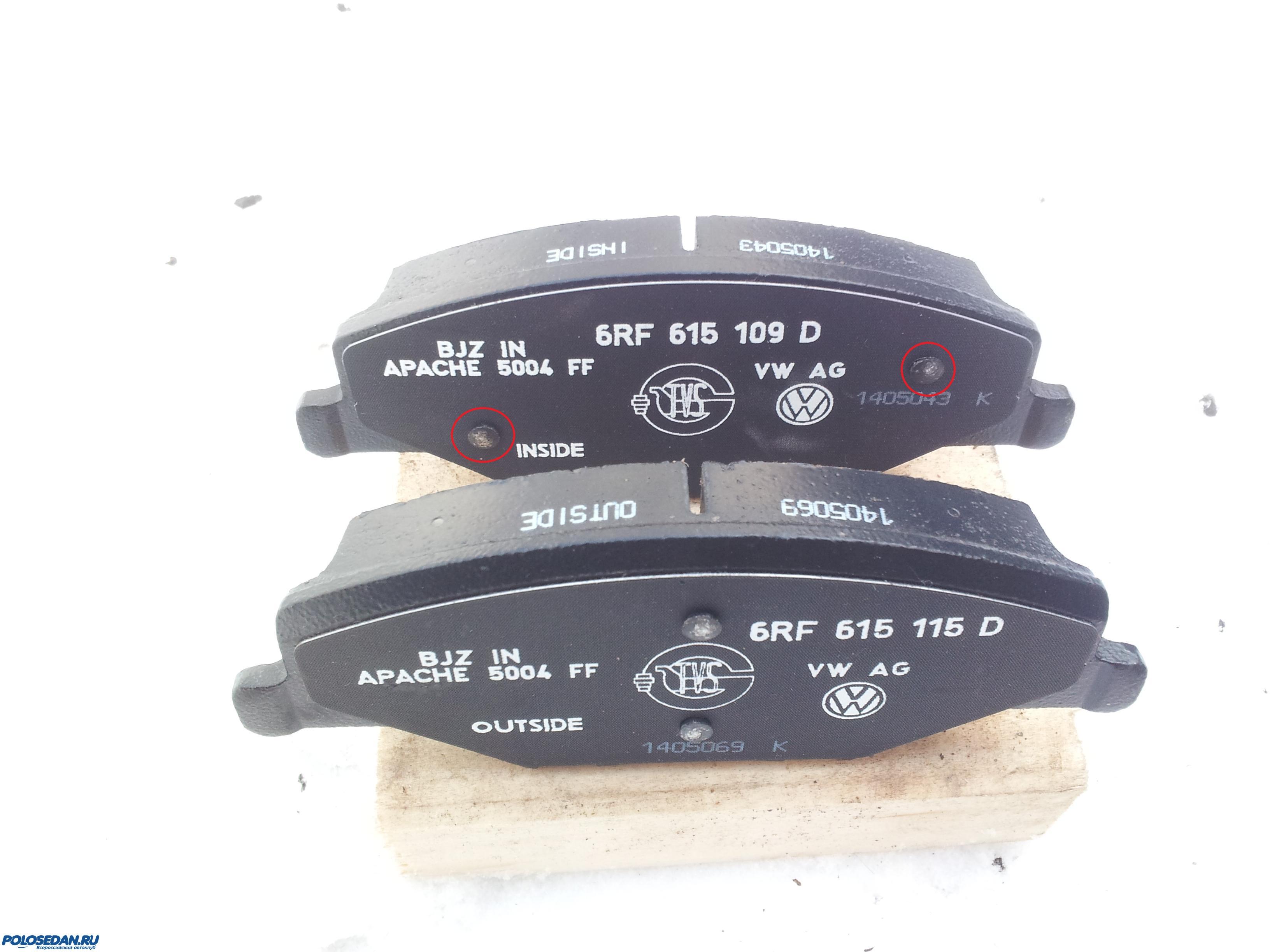 На суппорте VW AG внутреннюю с наружной колодкой поменять не получится - заклепки внутренней колодки (на фото ниже, обведены красным) будут мешать ей прижиматься к внутренней стороне корпуса подвижного суппорта. Можно собрать из двух комплектов четыре наружные колодки (с надписью "OUTSIDE"), они встанут нормально, проверено. При этом никакого скрежета и хруста.