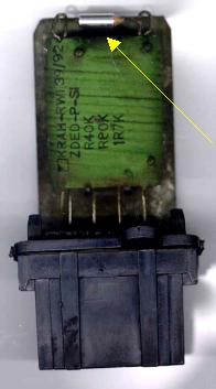 Рис.1 Блок управления (БУ) мотора вентилятора печки. Стрелкой показан злополучный термопредохранитель. Цилиндрик - это и есть умерший термопредохранитель.