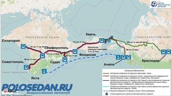 - личным автомобилем до перехватывающей парковки в поселке Ильич Темрюкского района Краснодарского края, далее автобусом-паромом-автобусом до шести городов — Керчи, Феодосии, Симферополя, Севастополя, Евпатории, Судака — и обратно;