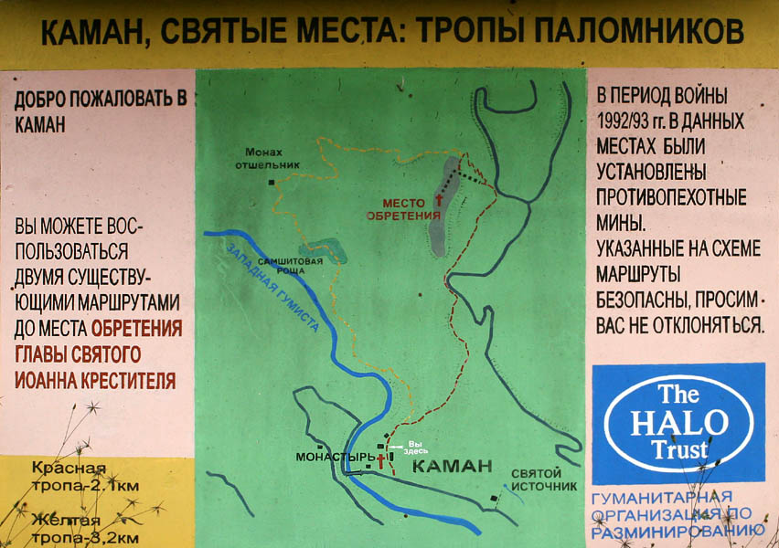Здесь провели свои последние дни Иоанн Златоуст и мученик Василиск, а совсем недалеко, буквально в двух километрах отсюда, — место Третьего обретения честной главы Святого Пророка, Предтечи и Крестителя Господня Иоанна. Спустившись от храма к подножию возвышенности, на которой он стоит, видим указатель — схему троп для паломников. Рядом надпись: «В период войны 1992/93 гг. в данных местах были установлены противопехотные мины. Указанные на схеме маршруты безопасны. Просим вас не отклоняться».