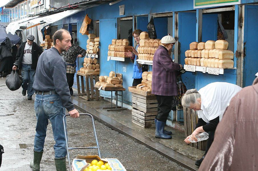 Сигареты, спиртные напитки и хлеб. Хлеб на лотках и в ларьках и снова на лотках. Ассортимент минимальный — белый кирпичик. Целый хлебный ряд.