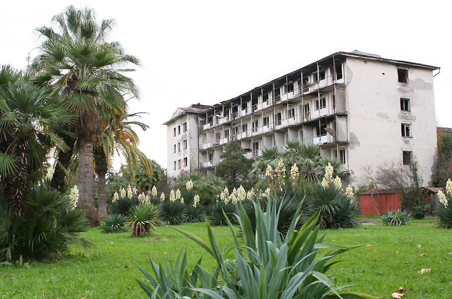 Первую мы увидели, выйдя из маршрутки у торгового центра «Континент», не так давно построенного в микрорайоне со старыми советскими пяти- и девятиэтажками. Здесь всё в лучших традициях общедоступного социалистического курорта восьмидесятых годов прошлого века. Пыльные улочки, стихийный рынок с пляжными принадлежностями. Броуновское движение толпы отдыхающих граждан. Красные, как раки, дядьки с распитием пива на ходу. На одном короткая не по росту майка с надписью: «Забил на кризис. Отдыхаю в Абхазии».