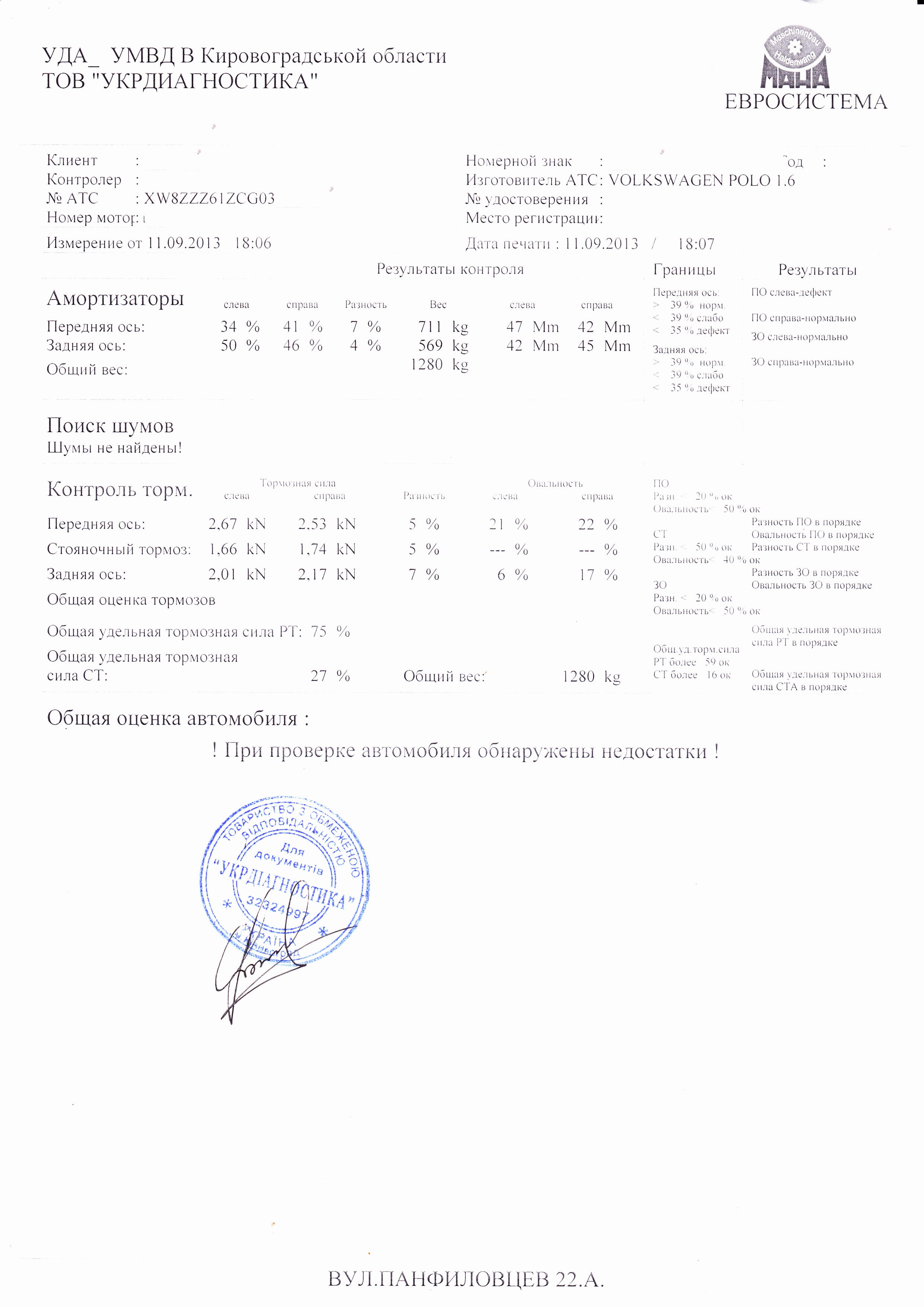 Идёт время, а с этим дребезжащий звук выносит мозги. Поехал в своем городе 11.09.2013г. на вибростенд. Заключение: сайленблоки, шаровые, стойки и коренные втулки штанги стабилизатора всё в полном порядке. Сам смотрел, щупал и даже сидел за рулем когда на вибростенде издевались над подвеской. Стука, дребезга НЕТ!!! (Что смотреть знаю и понимаю, далеко не первая машина, да и сам механик). Но дали распечатку осмотра. Оказалось передняя левая стойка по нижнему пределу ниже 35 % ---- значит не работает. (Скан ниже).
