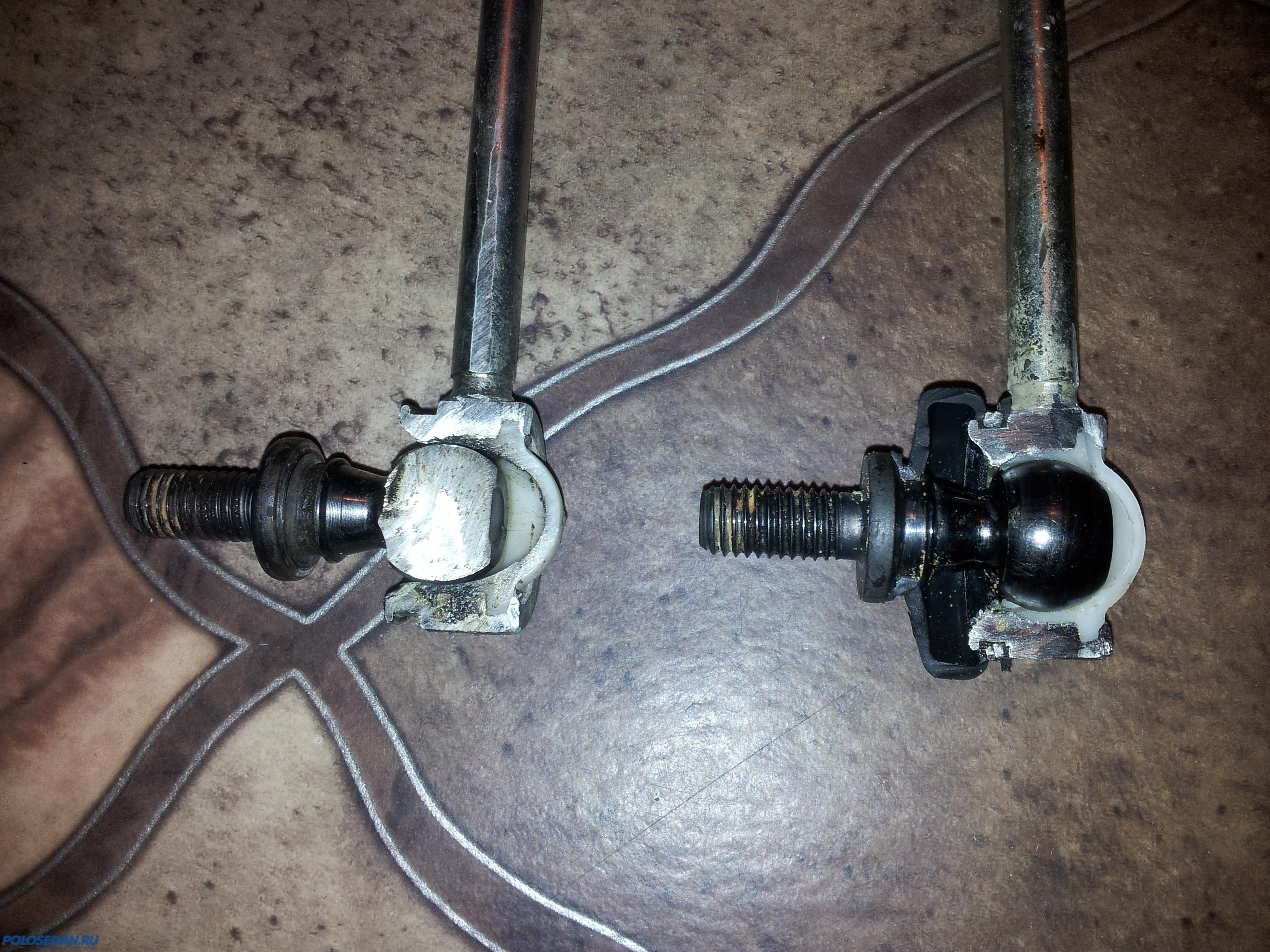 8. Ну и ради удовлетворения любопытства представляю фото оригинальных стоек с распиленными пополам женой болгарина посадочными местами шаровых пальцев. Сами посадочные места и шаровые пальцы отмыты от смазки. Слева - стучащая стойка, справа - еще "живая", не стучащая (на последней оставлены половинки защитных резиновых чехлов). Обратите внимание на толщину слоя белой пластмассы, в которую залиты шаровые пальцы - в стучащей стойки он меньше. Сам шар пальца закаленный, достаточно твердый и когда в определенный момент (особенно быстро это происходит при езде по убитым дорогам) он "разбивает" свое посадочное место в пластмассе, раздается характерный стук, исходящий из передней части авто с той стороны, где стойка уже начала "умирать".
