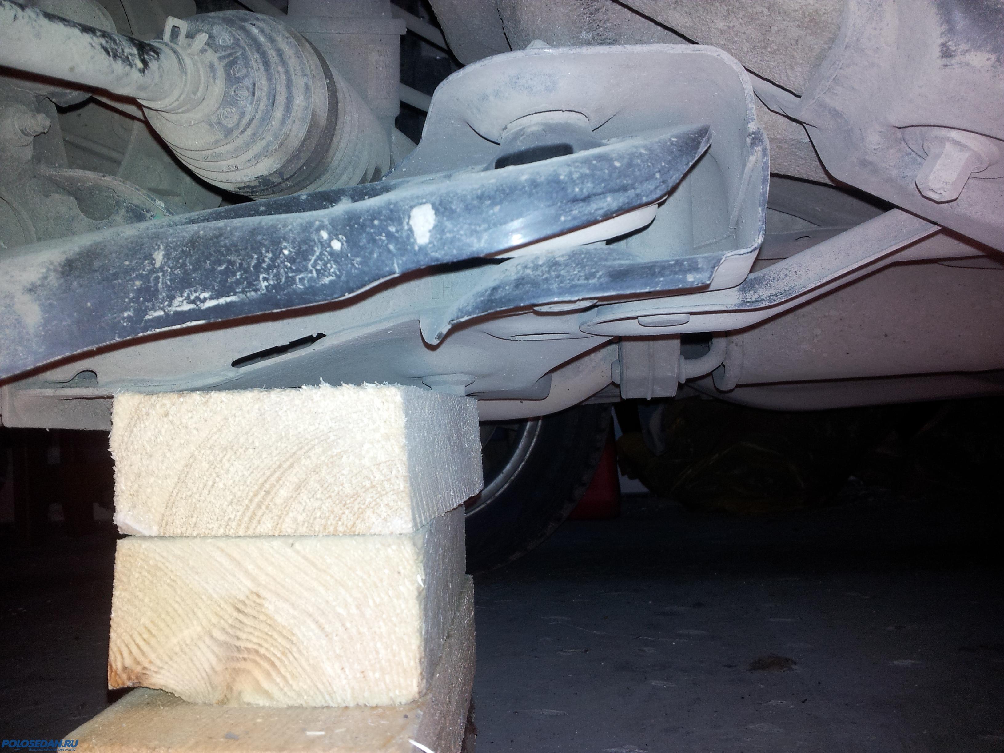 2. Подкладываем под подрамник машины деревянные бруски или деревянный пень подходящей высоты, немного отпускаем штатный домкрат так, чтобы подрамник «сел» на деревяшки. Домкрат при этом не снимаем, посадка подрамника на дерево необходима для того, чтобы авто не колыхалось при попытках откручивания-закручивания болтов и гаек треугольного рычага.