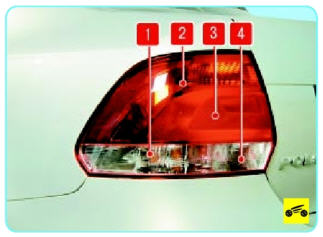 4 - лампа света заднего хода (в правом фонаре) или лампа заднего противотуманного света (в левом фонаре), тип лампы P21W (21 Вт);