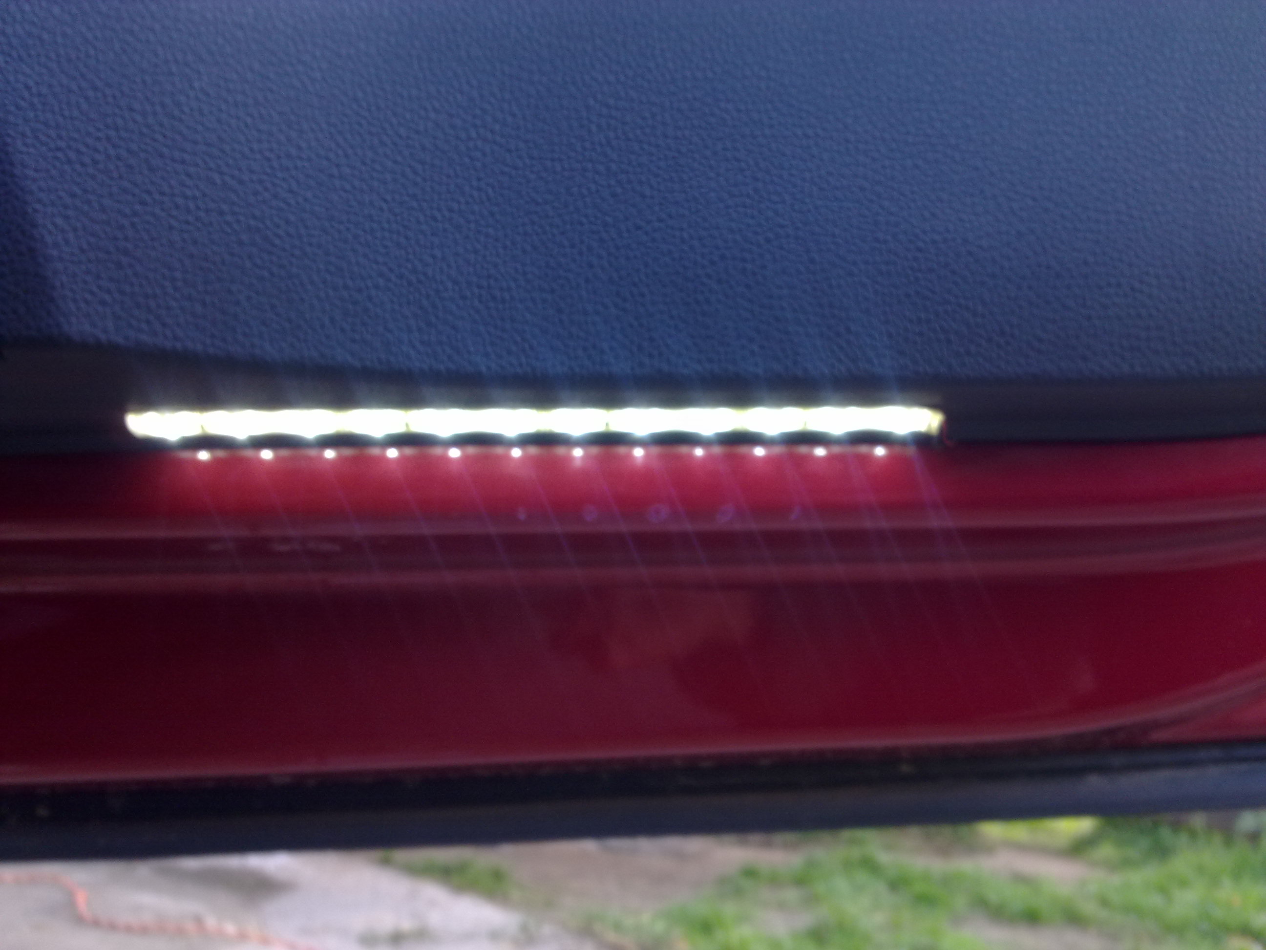 Основная проблема прокладки провода это протаскивание его через резиновый рукав в водительской двери. Прокладку лучше начинать от двери. Снимите карту (трос ручки можно не отключать). Карта держится на пистонах и винтах расположенных в ручке и 1 внизу карты. Заглушка в центре ручки подковыривается тонкой отверткой или ножом. После снятия карты вы увидите по середине в нижней части резиновый грибок откуда выходят все провода. Грибок легко снимается, с обратной стороны провода замотаны изолентой. Найдите краешек и аккуратно размотайте. Далее проволокой проденьте наш провод. Далее снимите с двери резиновую гофру что между дверью и кузовом. Снимается легко как и грибок. Да и от кузова снимается нормально, отсоедините разъем от кузова, потянув оранжевую хрень вниз. Теперь проволокой протяните провод через дверь в сторону гофры. Как и в случае с грибком размотайте изоленту на гофре у основания и проволокой протяните провод. Будьте осторожны гофра очень мягкая и ее легко проколоть проволокой. По закону жанра здесь надо ставить пины в разъемы, но у меня таких пинов не боло и я сделал провод неразъемным. Для удобства можно снять разъем с кузова, он фиксируется на 4 усиках и 2 зацепах снаружи, сожмите усики и чуть утопив верх у кузов снимите с нижних зацепов. В верхней части разъема есть довольно большое отверстие через которое мы и прокиним провод. Собирается все в обратной последовательности. Несколько слов о светодиодах. Я купил светодиодную ленту сразу на 3М скотче, а сверху слой прозрачного силикона, за ленту из 12 диодов около 100 рублей. Приклеил на карту двери снизу, а провод в щель между картой и дверью (ничего не сверлил и не подпиливал). При прокладке провода к задним дверям следите чтобы он не перетирался ремнем безопасности. Да чуть не забыл нюанс тянуть надо двухпроводный многожильный провод (я купил как в электронике используют для подключения выносных колонок черный и черно-красный). Вся фишка в том, что на плафоне используется в качестве управляющего провода минусовой, а плюс там постоянный. Поэтому надо к каждой ленте тянуть оба провода. Цвета для подключения корричнево-красный и корричнево-черный. Найти в двери постоянный плюс не получится. Вроде бы все. Если какие вопросы спрашивайте, отвечу