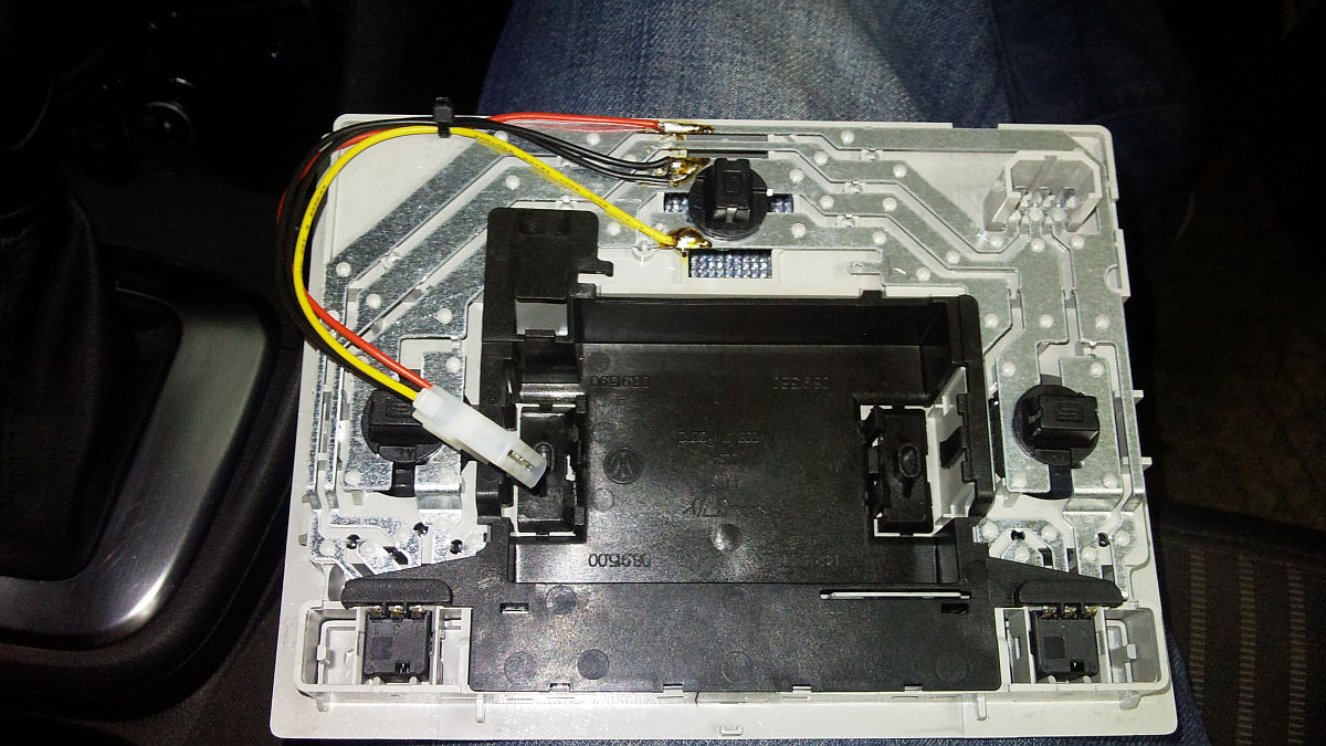 Комментарий к файлу: Вот так выполнил врезку к штатному светильнику. Красный - +12В, черный - земля, желтый - концевик от дверей. Одно "но", желтый подпаян после выключателя, чтобы можно было управлять задним плафоном с переднего. То есть оба фонаря работают параллельно. Разъем molex, фиксация проводов полиэтиленовой стяжкой. Соединение между фонарями - 1,5 метра тройного провода с разъемами molex-molex, приклеенный к потолку армированным скотчем.