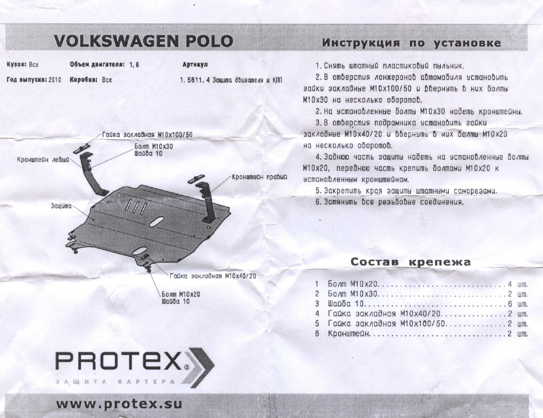 Всем доброго времени суток. Прошу не ругать сильно, но ... есть ли где фото инструкция по установке бяки, кою зовут Стальная защита «ЩИТ» для VOLKSWAGEN Polo Sedan (другие нашел, а вот ету нет). У меня наверно точно головы нет, но уже второй раз кручу ее и не получается ничерта у меня: крепления какие то маленькие, ни до чего не достают, да и вообще приложив ее на машинку снизу не понял а как она ваще там стоять то должна если она никуда не вписывается ни тем ни этим боком, все ей что-то и где-то мешает. Полку брал под новый год, хайлайн, автомат.
