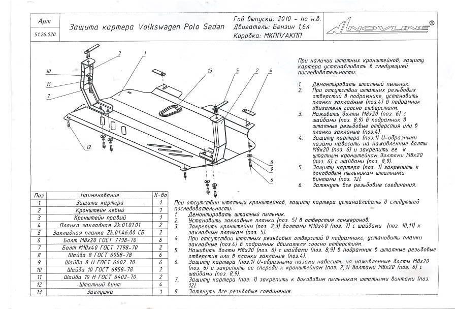 Т.к. оригинальные композитные (металлопластиковые) защиты на поло под артикулом 6R0 825 901 A (дорестайл, двигатель CFNA(B)) и 6C0 825 901 A (рестайл, двигатель CWVA(B) и CZCA) идут в комплекте без крепежа и кронштейнов (и стоят достаточно дорого), возможна их замена на оригинальные защиты от шкоды рапид, поставляемые полностью комплектными (крепеж и кронштейны присутствуют):
