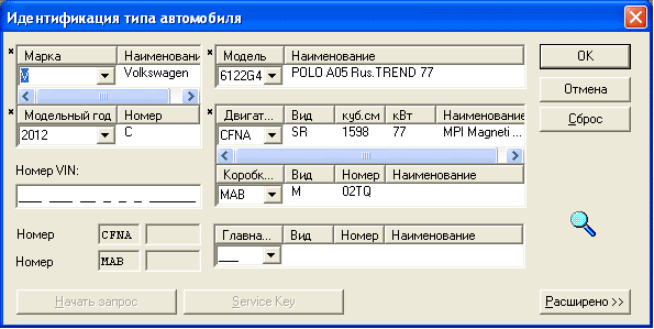 Вечером сделаю скрин окна выбора авто. По памяти: V, Поло 612, CNF, механика, тредлайн,