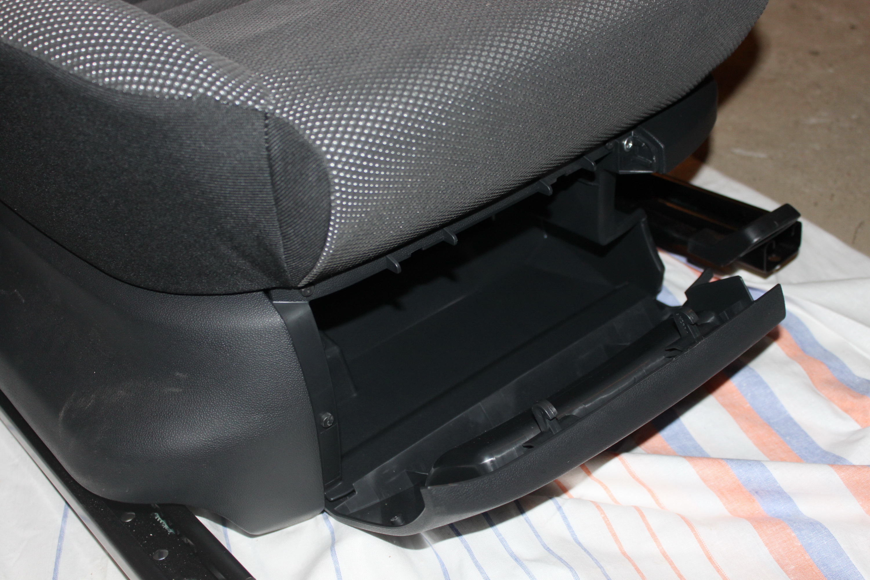И так. На днях установил вещевые ящики под сиденьями. Номера 6Y0 881 577 B47H (левый) и 6Y0 881 578 B47H (правый) (можно ставить ящики 6Y0 881 577 A47H и 6Y0 881 578 A47H соответственно, они ничем кроме букв A или B не отличаются). Стоят 500-800р каждый. Устанавливаются очень легко, всего на 4 самореза, единственное неудобство - необходимо снимать сиденья. Если кто захочет установить такие сидухи и приделать к ним ящики, лучше сделать это сразу, чтобы не делать лишнюю работу в виде снятия сидений. Очень удобные девайсы. Можно положить разную мелочь в виде тряпочек, перчаток, скребков и т.д. Вот небольшой отчет по их установке на примере пассажирского сиденья (водительский ставится аналогично):