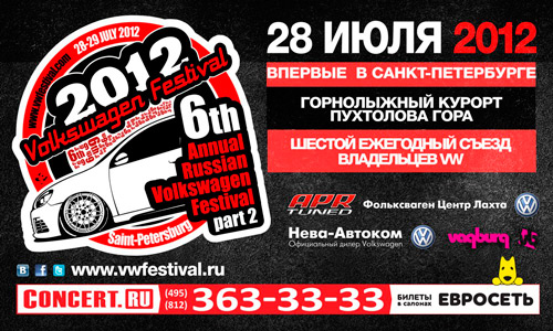 28-29 июля 2012, впервые в Санкт-Петербурге состоится второй этап ежегодного фестиваля автомобилей Volkswagen – VWFestival 2012, в котором примут участие более 500 автомобилей и около 30 автоклубов России.