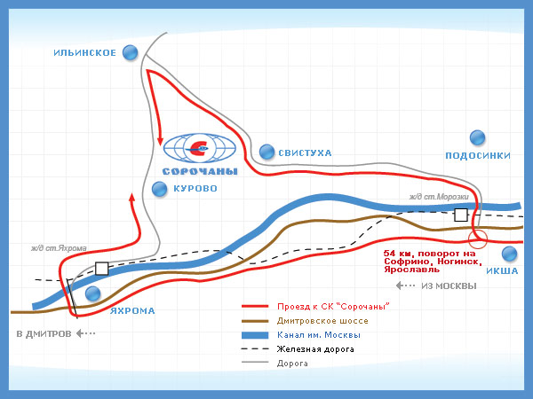 На 54 км Дмитровского шоссе (после п. Икша) следует повернуть направо (указатель на Ярославль, Софрино, Ногинск, Сорочаны), проехать через мост и сразу после моста, перед д. Подосинки, повернуть налево. Через 10 км, на Т-образном перекрестке в с. Ильинское, повернуть налево. В 2-х км от этого поворота находится курорт "Сорочаны". Автомобиль следует поставить на автостоянку (справа от курорта) и по подземному переходу пройти на территорию курорта.
