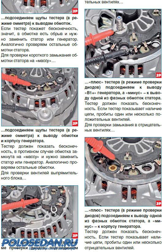 Rekt0r, увы и ах, если вы точно уверены, что дело в диодах - то поможет только какой-либо аналог (да еще постараться надо их из генератора выдрать, чтобы маркировку посмотреть). Реле-регулятор в сборе с щетками - это не то, диоды впрессованы в подковообразные держатели, а сам выпрямительный блок судя по описанию, крепится к корпусу генератора винтами. Отдельно диоды, как и выпрямительный блок, в официальном каталоге запчастей отсутствуют. Ниже инфа, как их продиагностировать при помощи обычного тестера.