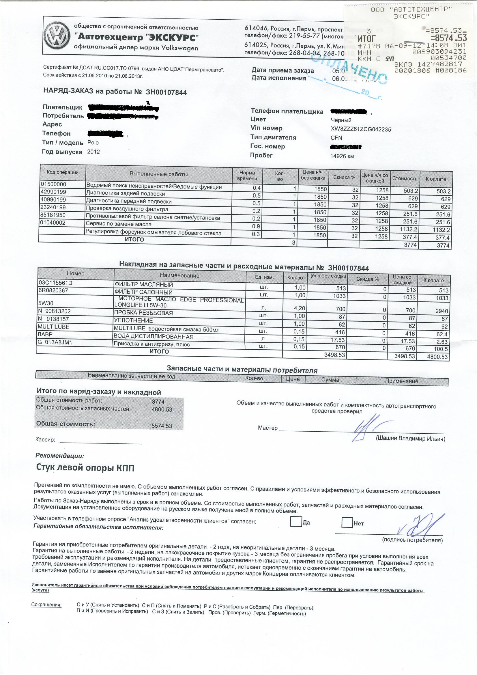 ТО-1 VW Север.Замена масла(на долив отдали порядка 250 грамм),масляного фильтра,пробки.Долив антифриза.Проверка аккумулятора.Смазка петель дверей.Проверка рулевой.Салонный фильтр не менял.Стоимость-4400 рублей. :good: