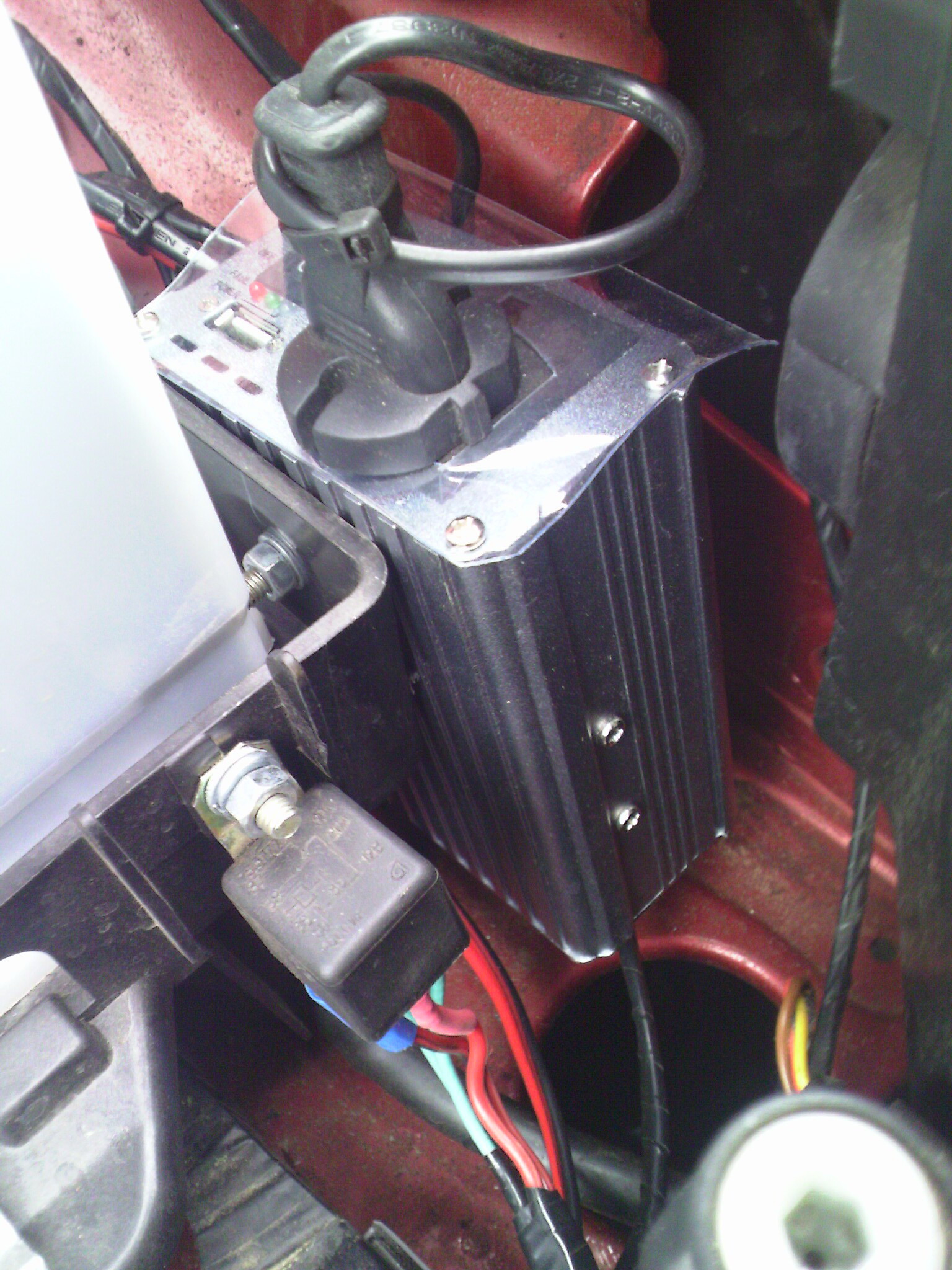 Над этим думал тоже. Но решил, что так как ток потребления инвертора от аккумулятора может доходить до 20 ампер, а значит при большой длине проводов на них будут большие потери, поэтому расположил его рядом с аккумулятором и подключил через реле 30A дальнего света от жигулей. Провода большего сечения тянуть из двигателя в салон и потом их прятать не очень удобно. В моторном отсеке инвертор охлаждается набегающим потоком воздуха. Ну вобщем поезжу , посмотрю, будут проблемы переделаю. В крайнем случае залью термоклеем внутреннюю плату и всего делов.