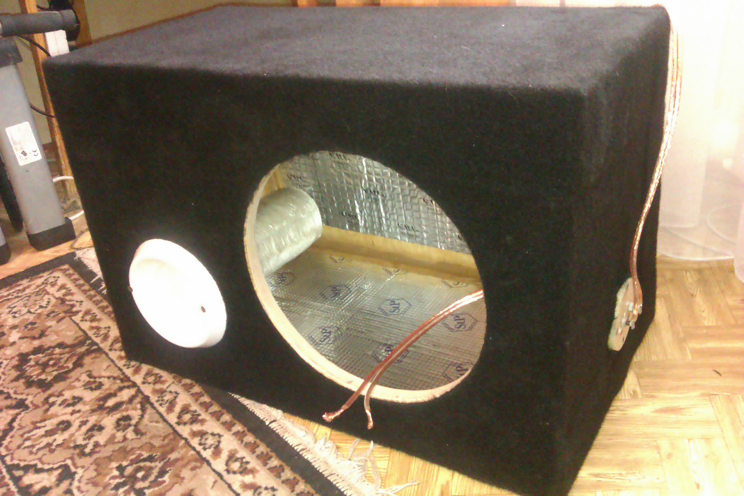 Доделал свой сабвуфер выкладываю фото на всеобщее обозрение. Делал из фанеры 20мм. Все расчеты с помощью программы Bassbox 6. Расчетный объем 57 литров. Качает намного лучше чем в закрытом ящике.