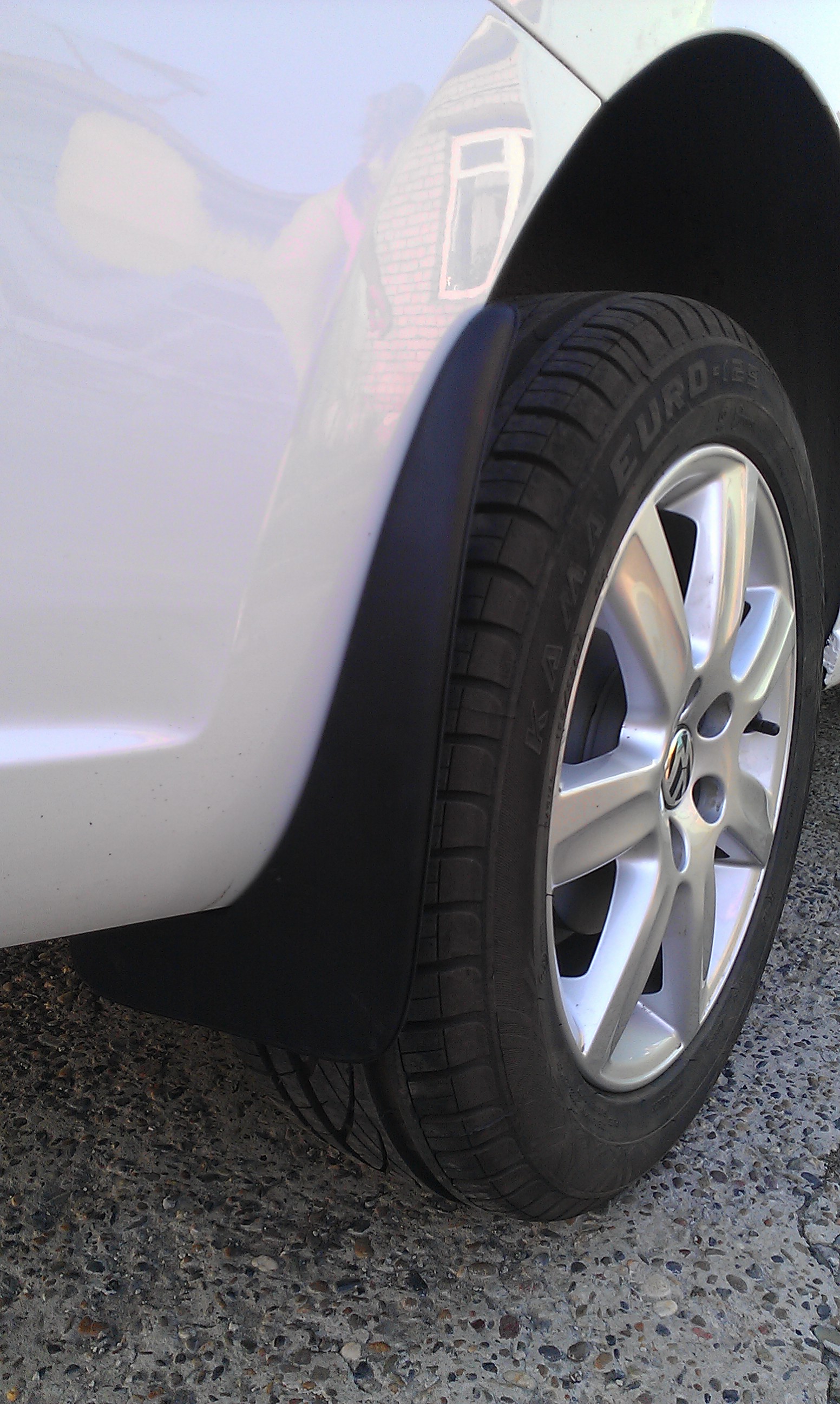 Передние вообще элементарно. Руль выкручиваешь в сторону для доступа. Двумя штатными саморезами и одним прилагаемым в комплекте прикручиваешь брызговик. Дырки проделывал маленьким ножичком. Легко, брызговики из плотной резины. И третий саморез (из комплекта) легко вкрутить в пластиковый подкрылок, предварительно также продырявив его немного ножиком.