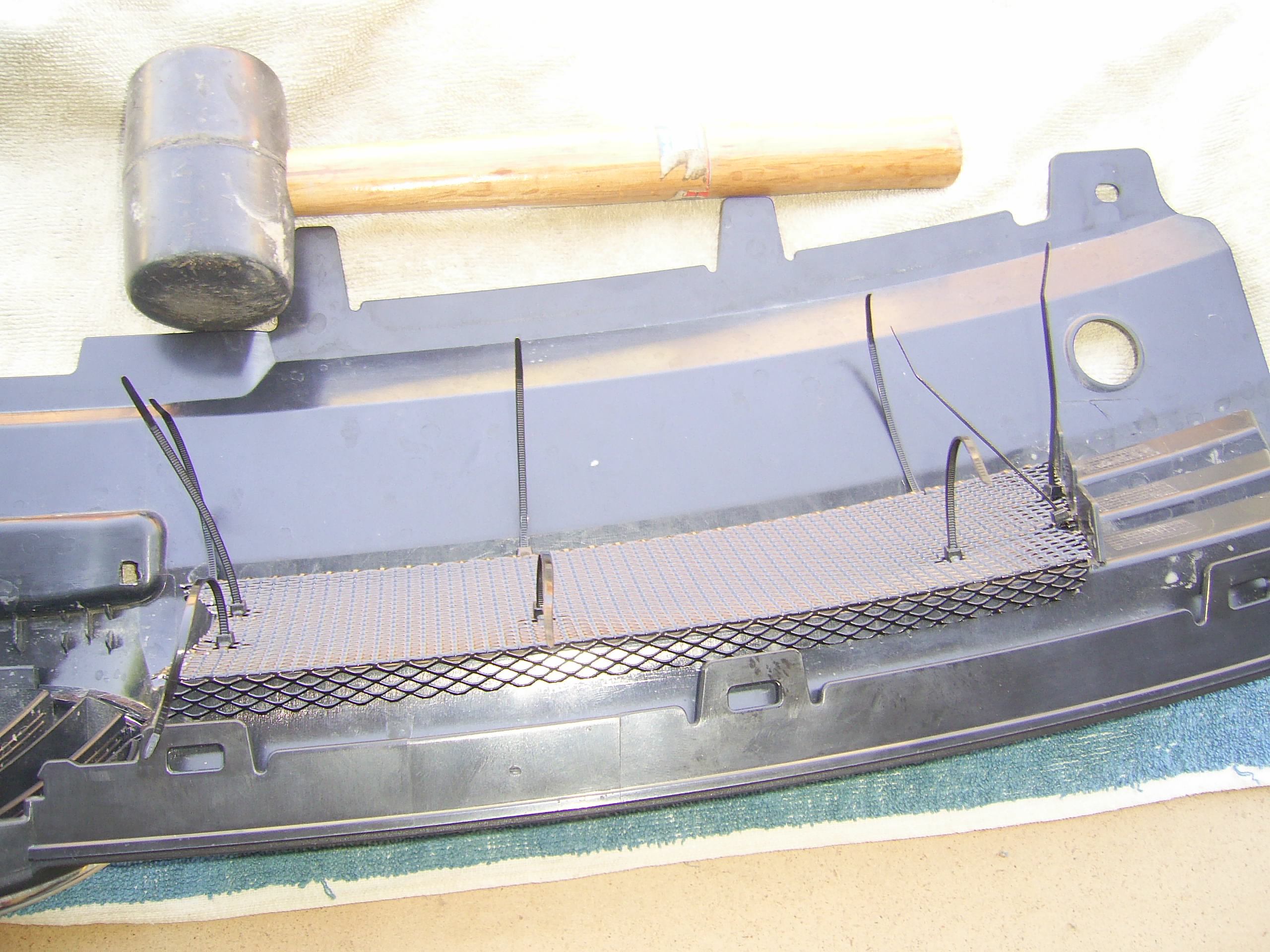 Довольно кропотливая работа. Сам собирался сделать что подобное, но купил в клубном магазине сетку на нижнюю решетку, которая защищает радиатор от насекомых и камешек (устанавливается за секунды). Теперь думаю что делать с верхней решеткой. А вообще возникает вопрос - имеет ли смысл ставить сетку на верхнюю решетку? Ведь за ней, как я понимаю нет радиатора, или я не прав?