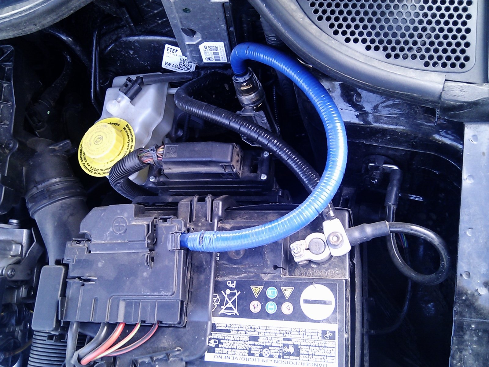 Забыл упомянуть о подключении силовых кабелей. В Polo данный момент продуман уже с завода и на аккумуляторных клеймах присутствуют соответствующие болты. Если с минусом все просто, то с плюсом мешалась пластиковая защита. Т.к. выкидывать ее не хотелось, то пришлось ее немного подрезать. На максимально близком расстоянии к аккумулятору была установлена колба с предохранителем на 150 ампер.