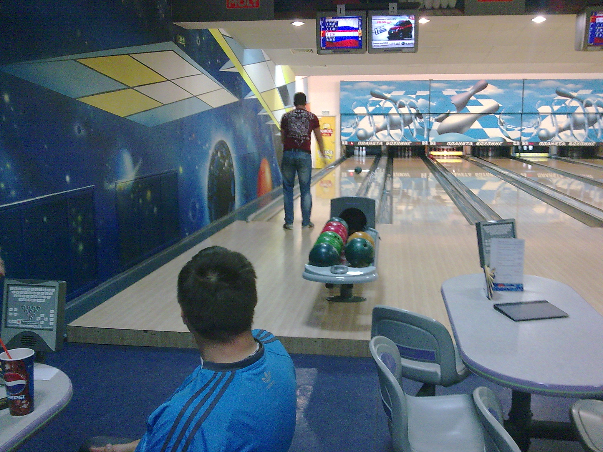 В данном боулинговом зале на каждой дорожке был столик с пятью стульями, что позволяет играть пяти игрокам. В сравнении с Диамантом, то там таких стульев четыре.