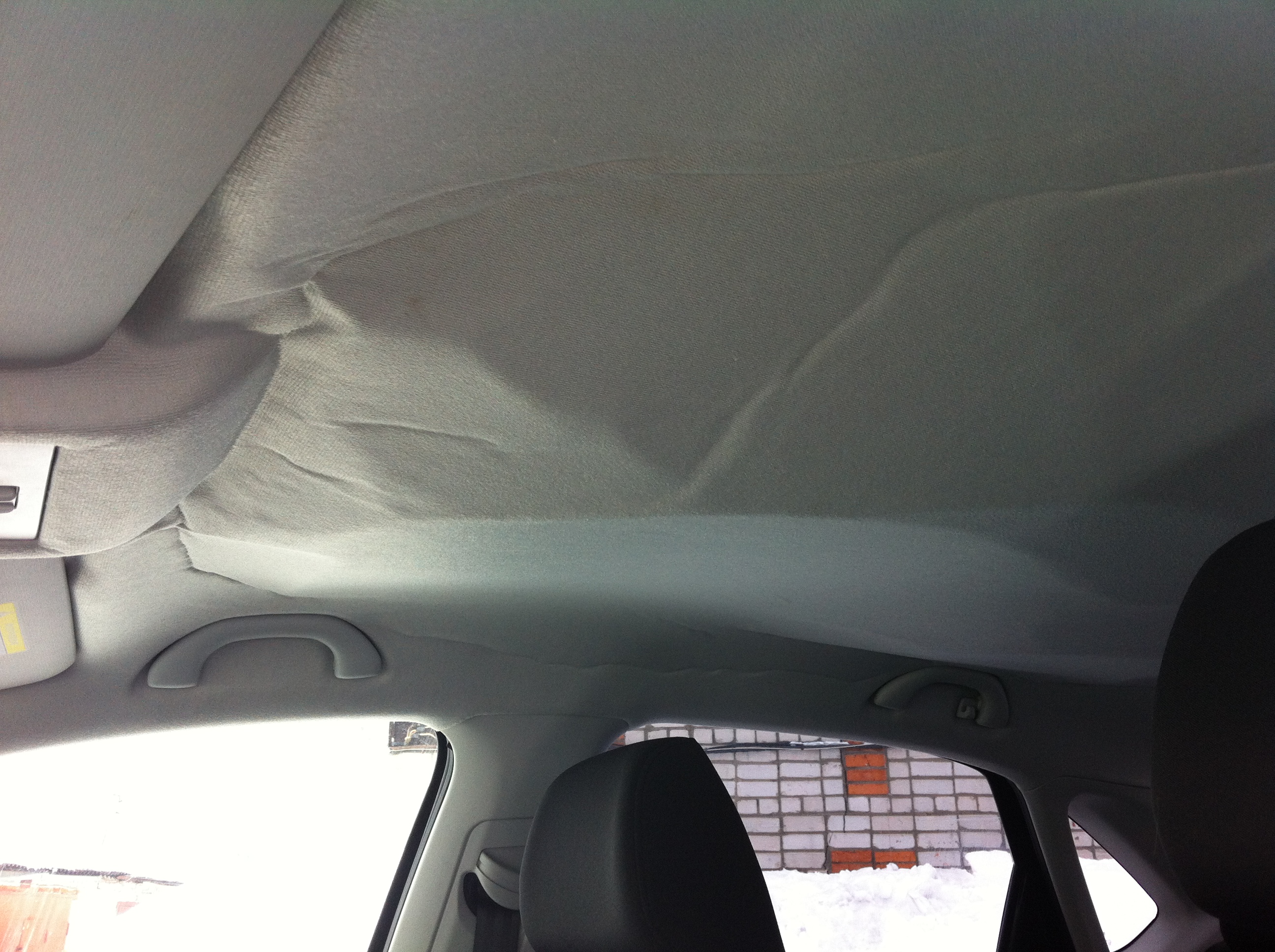 Здравствуйте! Потолок в салоне в районе заднего сиденья почему то стал волнообразным. Это заметно, если смотреть со стороны водительского места. Такое ощущение, как будто это место грязное, вначале и подумал что чем то запачкано. Но если смотреть со стороны задней двери, то все нормально. Изгиб потолка, а именно 2 волны, хорошо видно ночью, если светить фонариком со стороны водительского места. В этом ракурсе и сделан снимок.