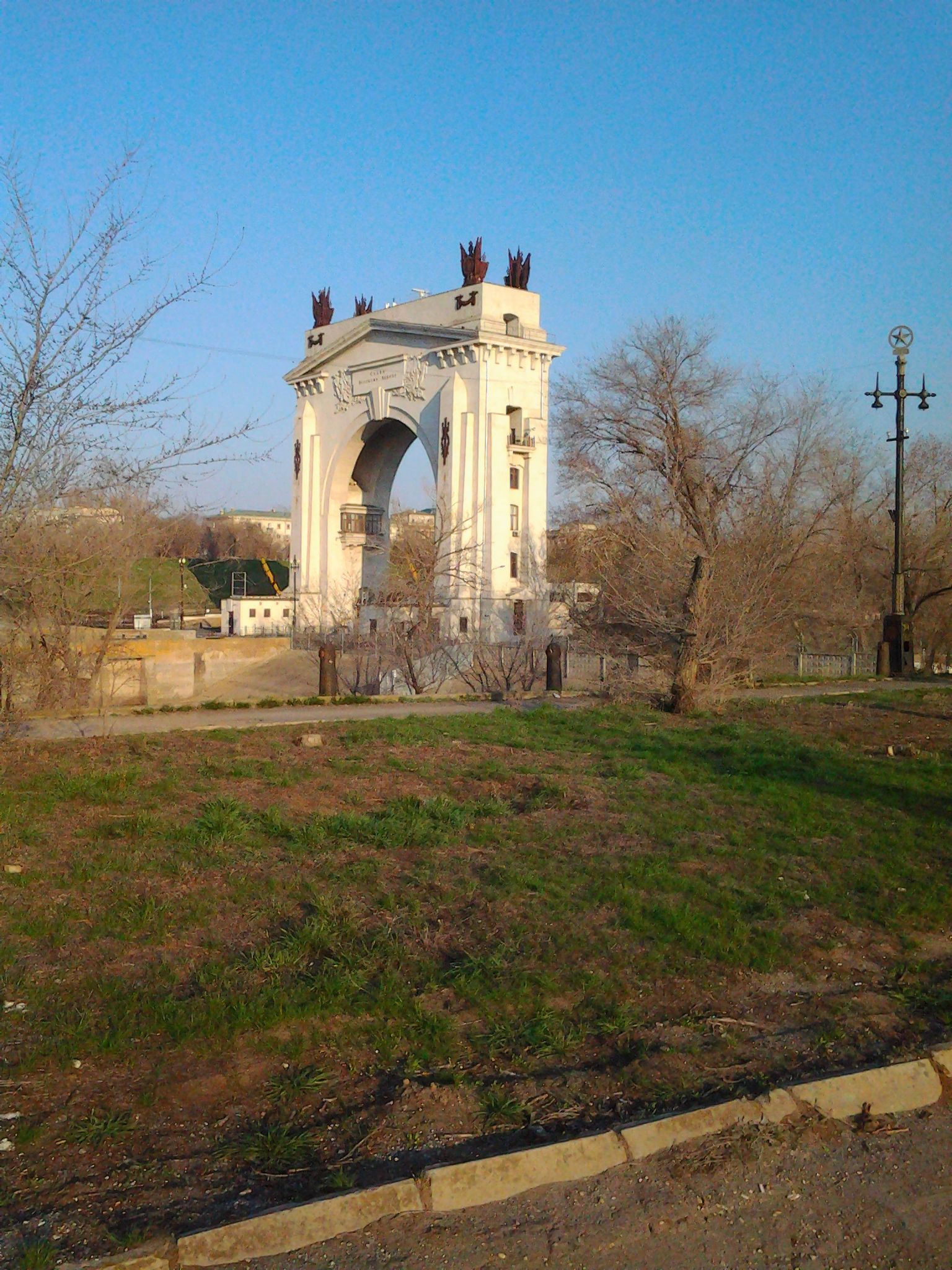Я считаю - это Арка первого шлюза и Монумент Ленину, на месте которого изначально находился монумент Ссталину.В этом можно убедиться , посмотрев фильм "Волга-Волга".