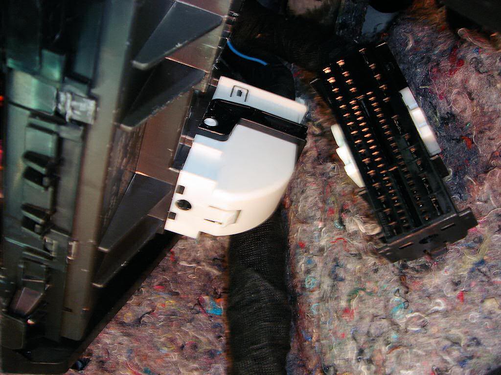 И так. Засовываем голову под торпеду и видим два больших разъема белый и черный (это как раз и есть разъемы блока электроники). Нам нужен белый. Отводим фиксатор разъема в направлении стрелки