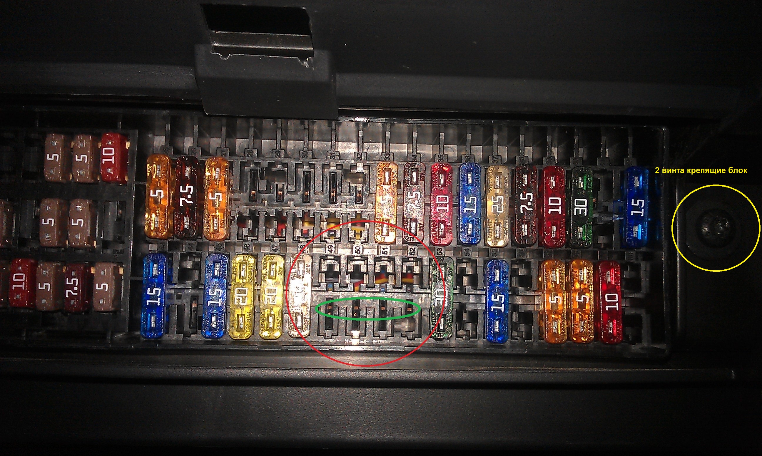 Я решил использовать гнездо №49, но можно использовать и верхний ряд предохранителей (+12В появляются при зажигании). Здесь нужно смотреть каждый конкретный случай, потому что схема менялась и расположение предохранителей соответственно тоже. Схемы можно найти
