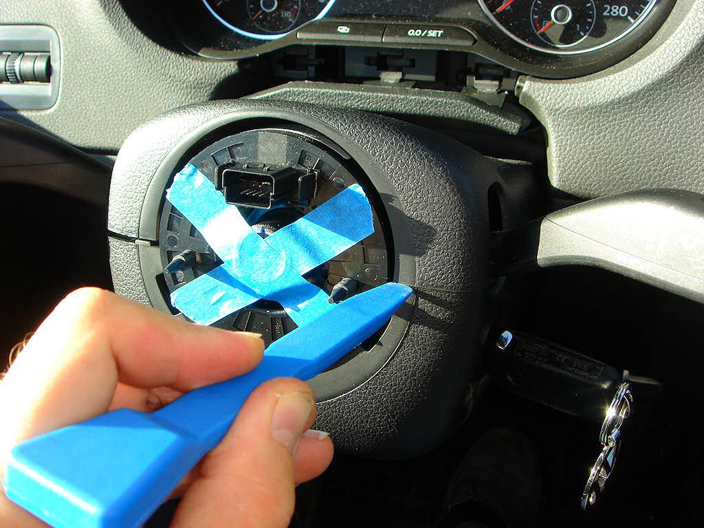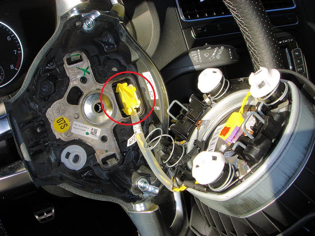 Далее снимаем подушку и отстегиваем ее разъем (желтый) от спирального кабеля: