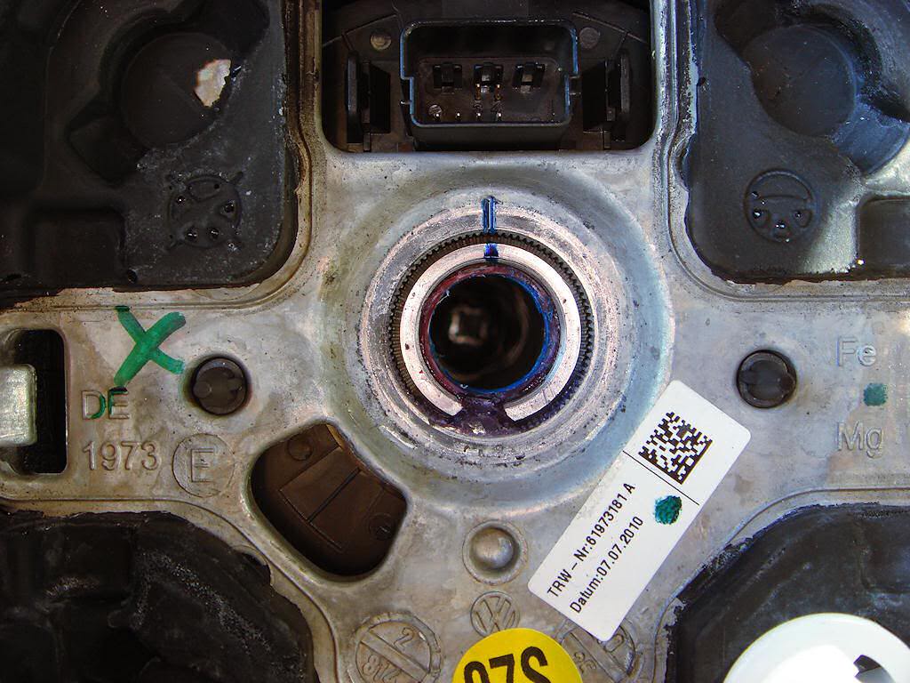Открутив гайку, видим что для правильного совмещения руля и рулевого вала, на них есть специальные метки. Нужно на это обратить внимание, когда будем устанавливать новый руль: