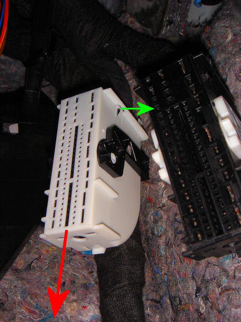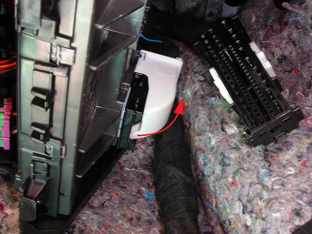 И так. Засовываем голову под торпеду и видим два больших разъема белый и черный (это как раз и есть разъемы блока электроники). Нам нужен белый. Отводим фиксатор разъема в направлении стрелки