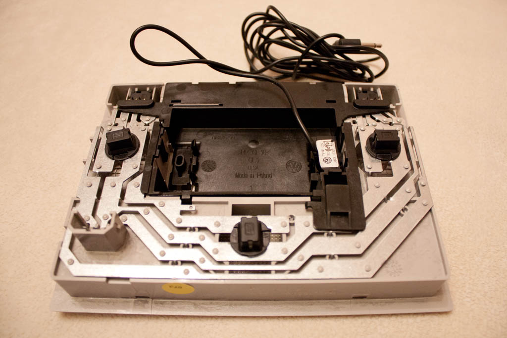3G-модем подошёл от предыдущей головы (Qualcomm 6000), МТСовский Huawei E150 тоже заработал, но как-то странно… Мудрить пока не стал, засунул за край ковролина, потом окультурим. Внутренний микрофон для громкой связи слышно, но не идеально, а вот внешний — вообще хорошо, прилепил сначала за рулём, а чуть позже поставил на штатное место в светильнике в корпусе от родного микрофона.
