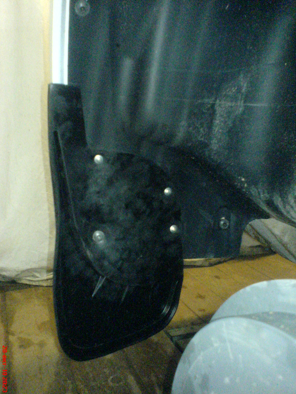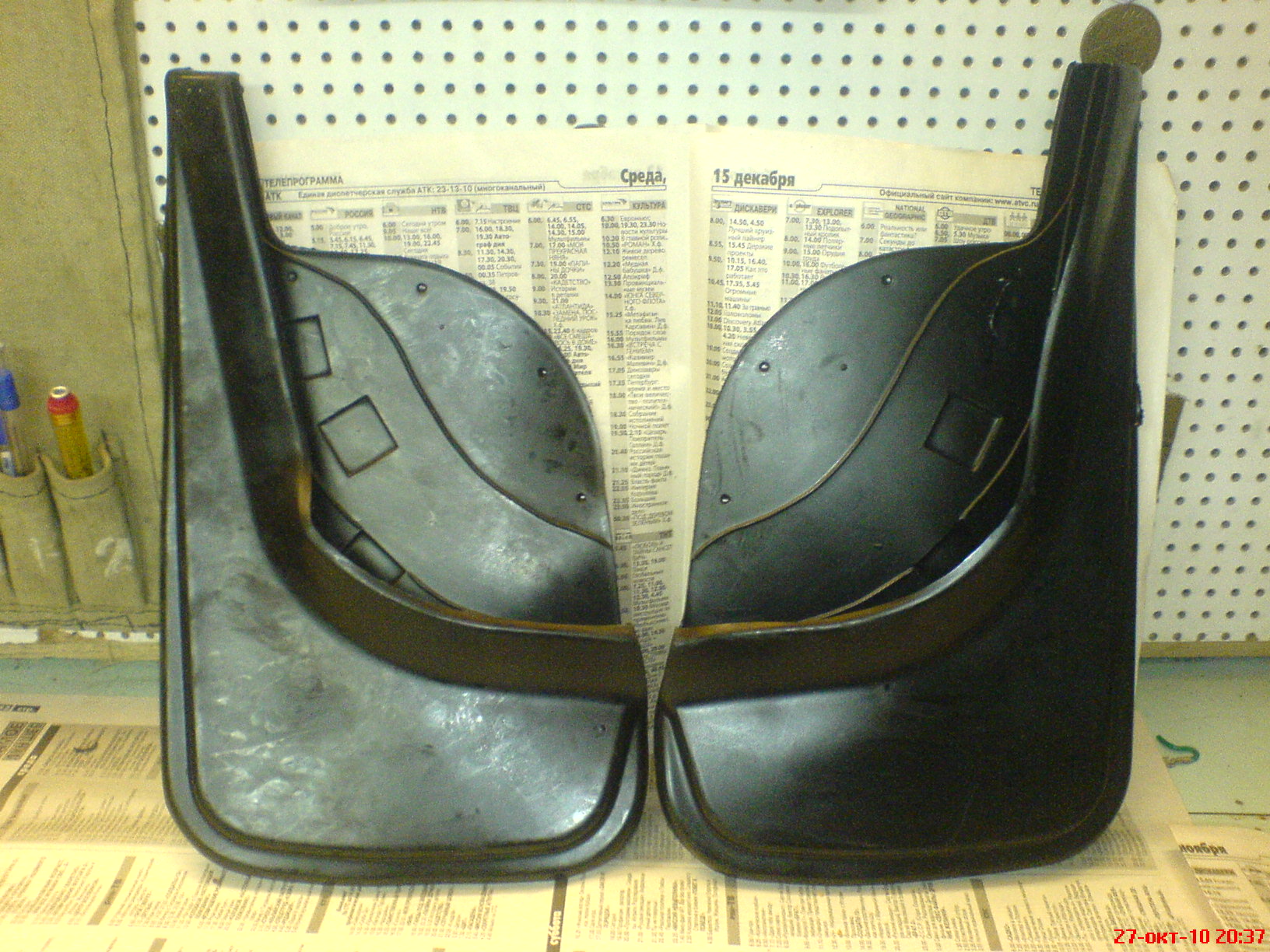 Посмотрел брызговики - сделаны из твердого пластика, никаких логотипов на них нет. Установлены аккуратно с помощью клёпок. На фотке видно