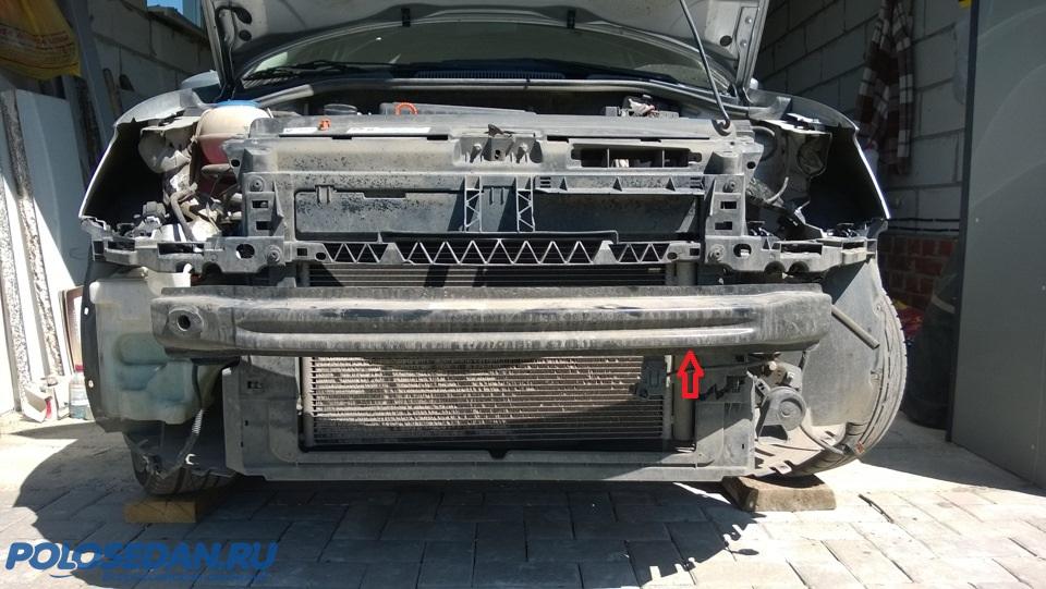 Снимаем нижнюю решетку радиатора и сверлим отверстие под саморез , там где стрелки . Далее заворачиваем саморез , желательно с шайбочкой . Аналогично с другой стороны . И вуаля , бампер поднимается , зазоры пропадают и все чинно благородно .
