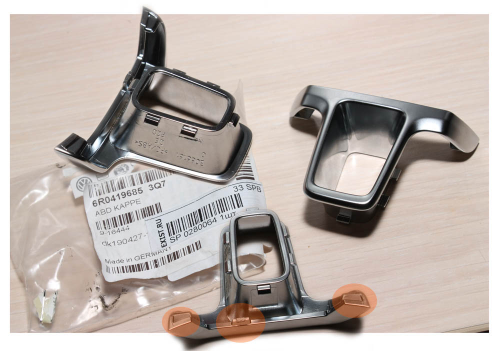 То самый элемент рулевого колеса, вместо которого на кожаном мультируле крепиться данная хромированная деталька, на обычном руле выглядит как единое целое с рулем. Т.е. что бы эту хромированную вставку на обычный руль примострячить, нужно часть руля просто вырезать до металла. Как Вы себе это представляете в домашних условиях???
