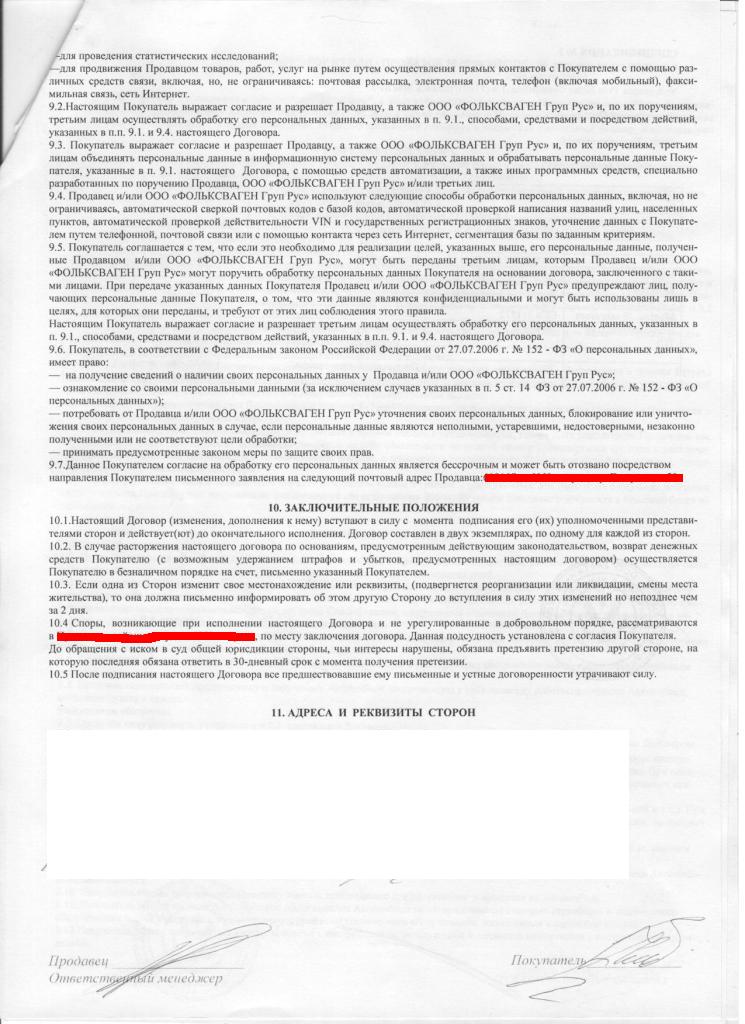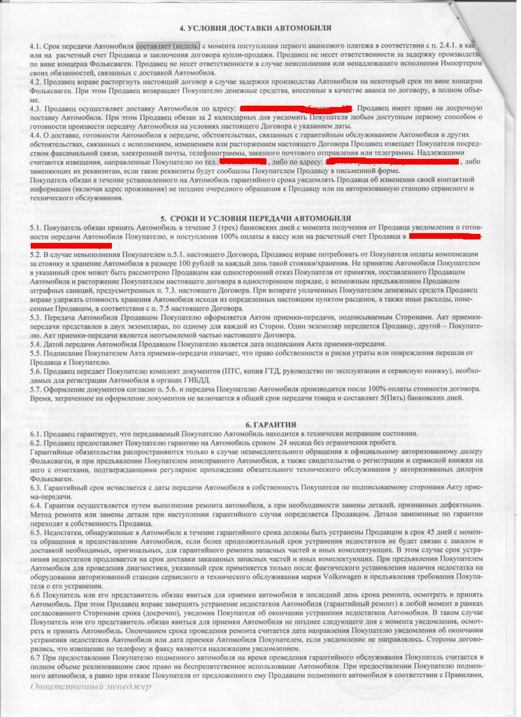 Когда я напомнил о своих правах, как покупателя, мой собеседник сказал следующее, хотите всё по закону и договору будет вам по договору, машину получите спустя 8 дней, руководствуясь пунктами договора (скан прикреплён, почитайте) 5.1 и 5.7. при этом дата выдачи была названа - 8 апреля 2011г. Не понятно как он считал.. После такого ответа я некоторое время пребывал в шоке... как так, что значит хотите по договору будет по договору.. то есть это какой то заведомо не лучший вариант получается.. долго мы потом ещё это обсуждали... в общем ужас.